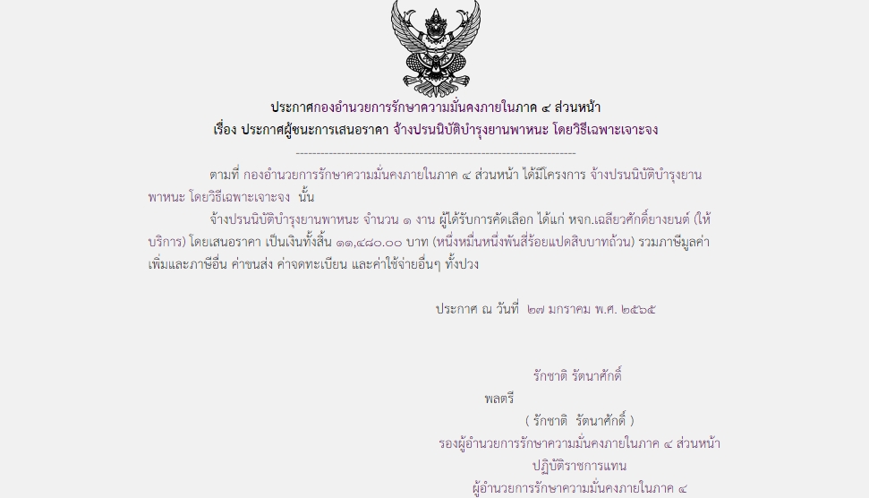 ประกาศผู้ชนะการเสนอราคา จ้างปรนนิบัติบำรุงยานพาหนะ โดยวิธีเฉพาะเจาะจง