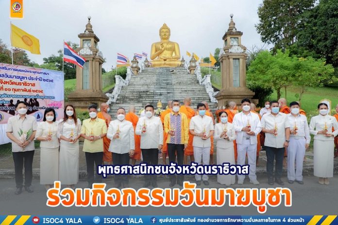 วันนี้ (16 ก.พ.65) ที่พุทธมณฑลจังหวัดนราธิวาส อ.เมืองนราธิวาส นายสนั่น พงษ์อักษร ผู้ว่าราชการจังหวัดนราธิวาส เป็นประธานฝ่ายฆราวาส นำรองผู้ว่าราชการจังหวัดนราธิวาส ปลัดจังหวัดนราธิวาส หัวหน้าส่วนราชการ ทหาร ตำรวจ และพุทธศาสนิกชนจังหวัดนราธิวาส ประกอบพิธีทำบุญตักบาตร เนื่องในวันมาฆบูชา ประจำปี 2565 โดยมีพระครูไพโรจน์ธรรมมานุกูล เจ้าคณะตำบลลำภู/เจ้าอาวาสวัดกำแพง เป็นประธานฝ่ายสงฆ์ นำพระภิกษุ และพุทธศาสนิกชนผู้ร่วมพิธี สวดมนต์บูชาพระรัตนตรัย สรรเสริญพระพุทธคุณ พระธรรมคุณ พระสังฆคุณ