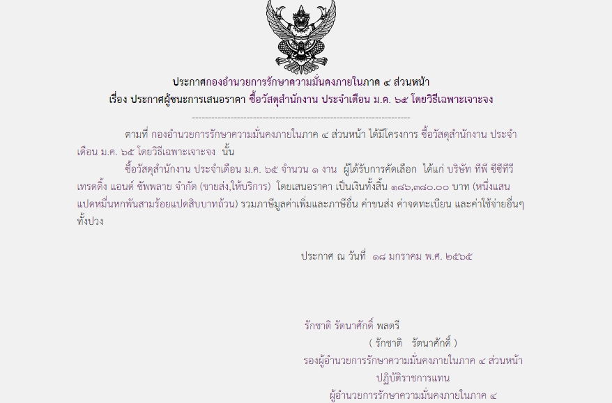 ประกาศผู้ชนะการเสนอราคา ซื้อวัสดุสำนักงาน ประจำเดือน ม.ค.๖๕ โดยวิธีเฉพาะเจาะจง (๑๘๖,๓๘๐.๐๐บาท)