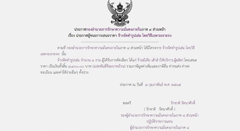 ประกาศผู้ชนะการเสนอราคา จ้างจัดทำรูปเล่ม โดยวิธีเฉพาะเจาะจง (8,400 บาท)
