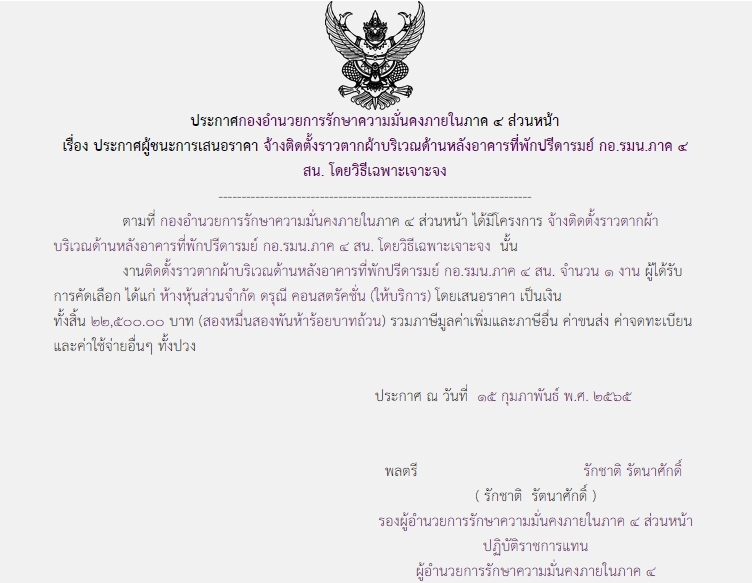 จัดซื้อ จัดจ้างประกาศผู้ชนะการเสนอราคา ประกาศผู้ชนะการเสนอราคา จ้างติดตั้งราวตากผ้าบริเวณด้านหลังอาคารที่พักปรีดารมย์ กอ.รมน.ภาค ๔ สน. โดยวิธีเฉพาะเจาะจง (๒๒,๕๐๐.๐๐บาท) February 20, 2022 428 Share Facebook Twitter Google+ Telegram LINE