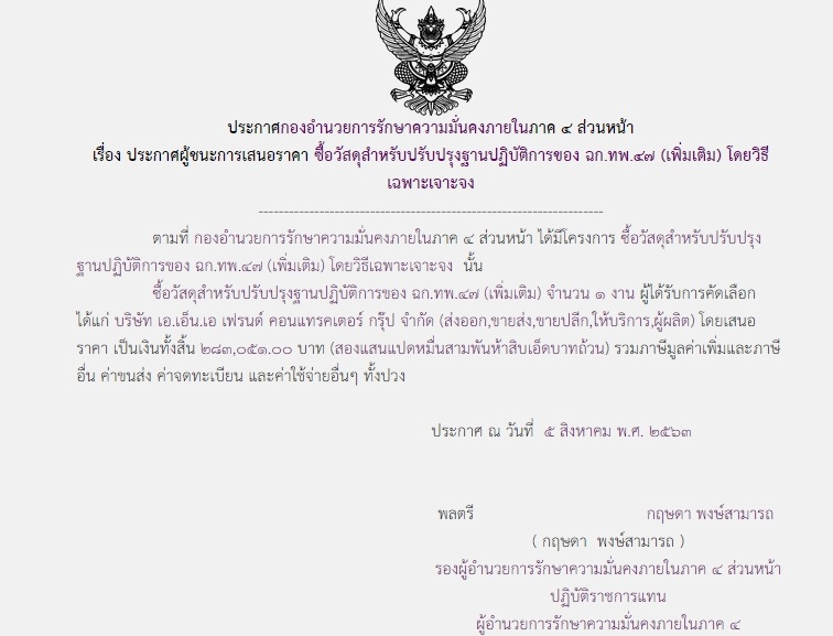 ประกาศผู้ชนะการเสนอราคา ซื้อวัสดุสำหรับปรับปรุงฐานปฏิบัติการของ ฉก.ทพ.๔๗ (เพิ่มเติม) โดยวิธีเฉพาะเจาะจง
