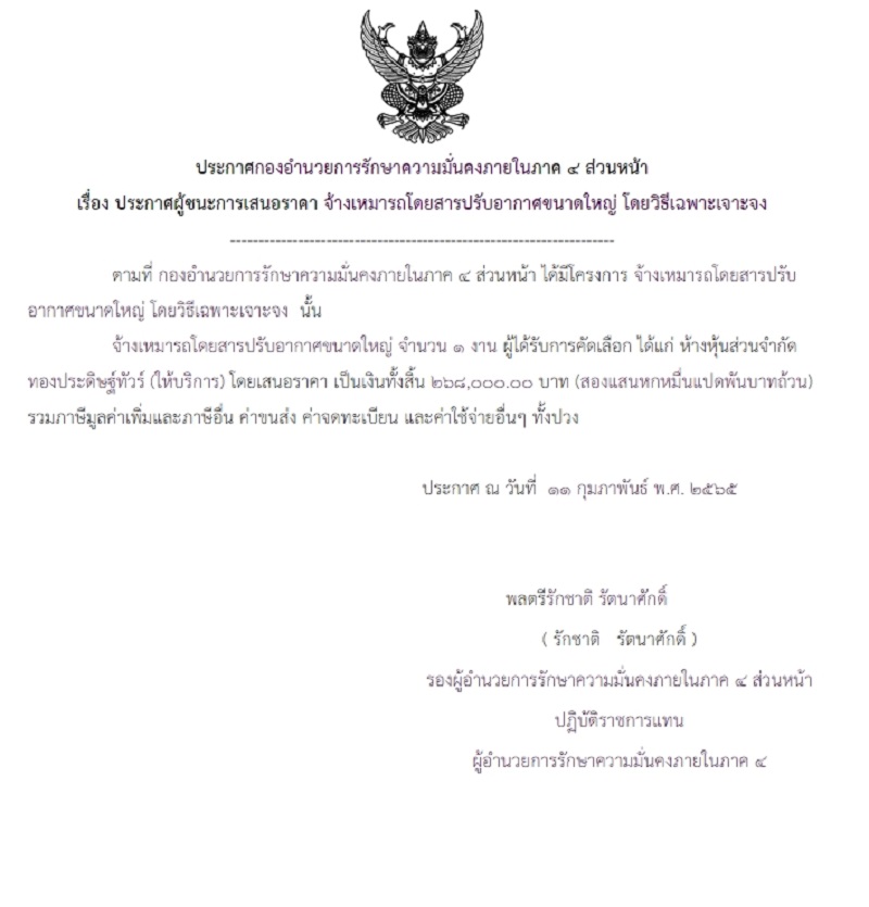 ประกาศผู้ชนะการเสนอราคา จ้างเหมารถโดยสารปรับอากาศขนาดใหญ่ โดยวิธีเฉพาะเจาะจง