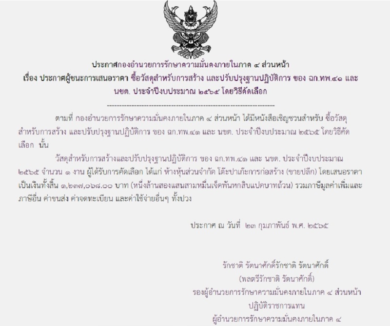 จัดซื้อ จัดจ้างประกาศผู้ชนะการเสนอราคา ประกาศผู้ชนะการเสนอราคา ซื้อวัสดุสำหรับการสร้าง และปรับปรุงฐานปฏิบัติการ ของ ฉก.ทพ.41 และ นขต. ประจำปีงบประมาณ 2565 โดยวิธีคัดเลือก February 23, 2022 511 Share Facebook Twitter Google+ Telegram LINE