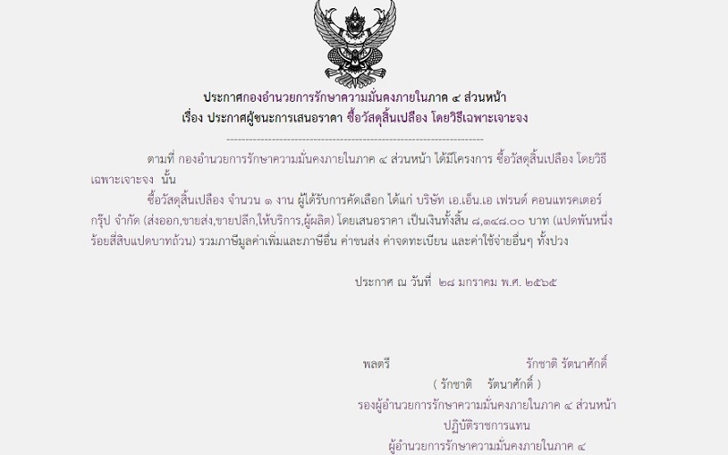 ประกาศผู้ชนะการเสนอราคา ซื้อวัสดุสิ้นเปลือง โดยวิธีเฉพาะเจาะจง