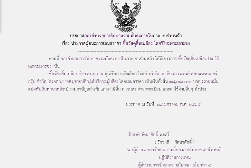 ประกาศผู้ชนะการเสนอราคา ซื้อวัสดุสิ้นเปลือง โดยวิธีเฉพาะเจาะจง (38,016 บาท)