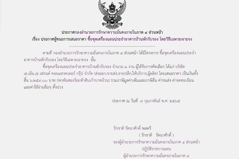 ประกาศผู้ชนะการเสนอราคา ซื้อชุดเครื่องนอนประจำอาคารบ้านพักรับรอง โดยวิธีเฉพาะเจาะจง