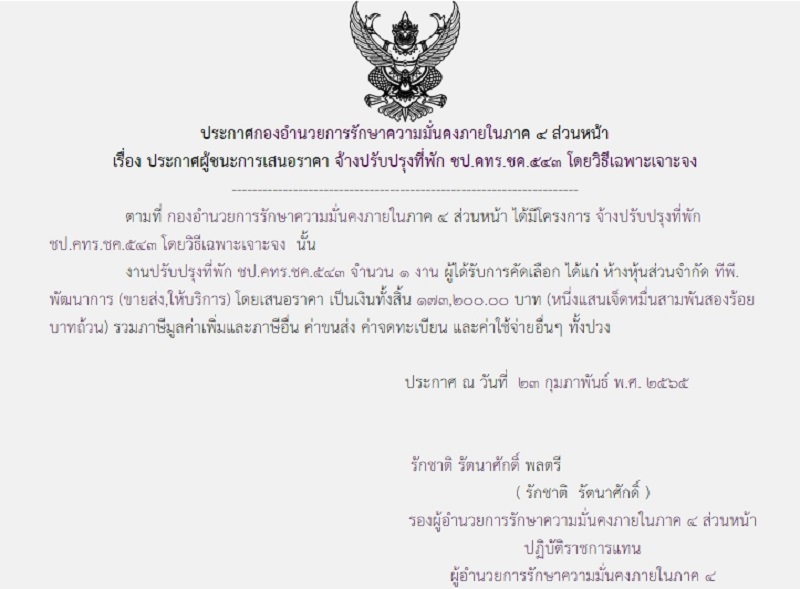 ประกาศผู้ชนะการเสนอราคา จ้างปรับปรุงที่พัก ชป.คทร.ชค.543 โดยวิธีเฉพาะเจาะจง