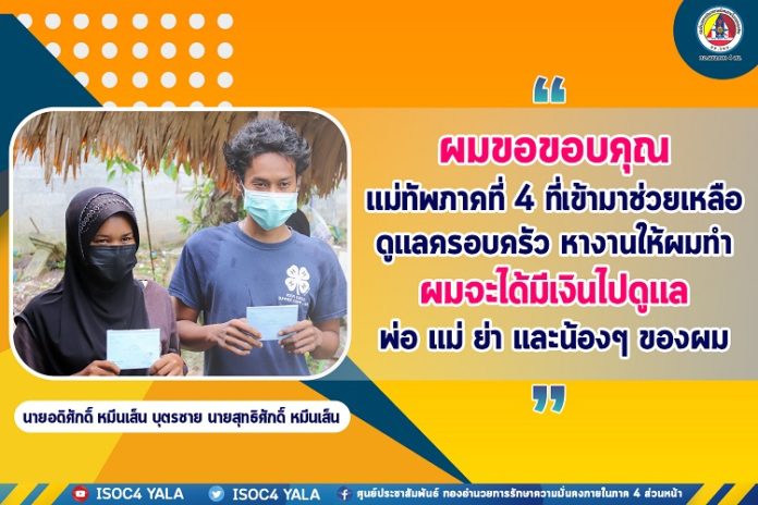 ประชาสัมพันธ์ข่าวประชาสัมพันธ์ “ผมขอขอบคุณ แม่ทัพภาคที่ 4 ที่เข้ามาช่วยเหลือ ดูแลครอบครัว หางานให้ผมทำ ผมจะได้มีเงินไปดูแล พ่อ แม่ ย่า และน้องๆ ของผม” March 1, 2022 702 Share Facebook Twitter Google+ Telegram LINE นายอดิศักดิ์ หมีนเส็น บุตรชาย นายสุทธิศักดิ์ หมีนเส็น ผู้ได้รับบาดเจ็บจากกรณีคนร้ายลอบวางระเบิดในพื้นที่ อ.จะนะ จ.สงขลา ศูนย์ประชาสัมพันธ์ กองอำนวยการรักษาความมั่นคงภายในภาค4ส่วนหน้า