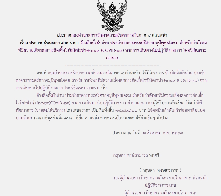 ประกาศผู้ชนะการเสนอราคา จ้างติดตั้งผ้าม่าน ประจำอาคารพระศรีศากยมุนีพุทธโคดม สำหรับกำล้งพลที่มีความเสี่ยงต่อการติดเชื้อไวรัสโคโรน่า-2019(COVID-19) จากการเดินทางไปปฏิบัติราชการ โดยวิธีเฉพาะเจาะจง (79,968.00)