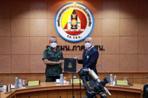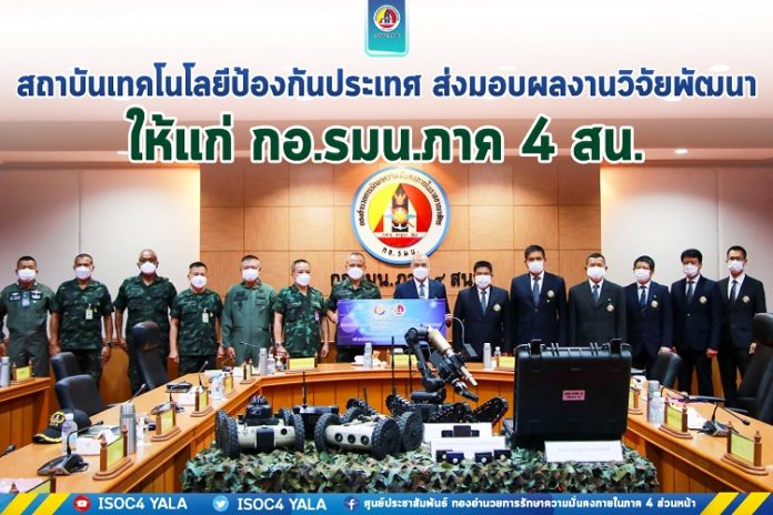 พลเอก ชูชาติ บัวขาว ผอ.สปท. กล่าวว่า มีความมั่นใจกับ กอ.รมน.ภาค 4 สน. และนักรบกล้าทุกคนที่ได้ปกป้องด้ามขวานของเราทำให้ส่วนกลางมีความอุ่นใจ วันนี้ได้มาร่วมส่งมอบต้นแบบงานวิจัยเกิดขึ้น จากความร่วมมือระหว่าง สทป. และ กอ.รมน.ภาค 4 สน. จำนวน 2 โครงการ ประกอบด้วย โครงการระบบสารสนเทศแบบรวมศูนย์และโปรแกรม ประยุกต์ และโครงการหุ่นยนต์เก็บกู้วัตถุระเบิด ได้ร่วมกันวิจัยและพัฒนามาอย่างต่อเนื่อง ตั้งแต่ปี 2559 โดยเริ่มต้นจากการหาโจทย์ร่วมกัน ศึกษาแนวทางปฏิบัติกับภาคส่วนต่าง ๆ โดยเฉพาะอย่างยิ่งสถาบันการศึกษาด้วยการแลกเปลี่ยนองค์ความรู้และประสบการณ์ รวมถึงร่วมกันทดสอบ ทดลอง และประเมินผล ได้มาซึ่งต้นแบบงานวิจัยและพัฒนาในวันนี้ อีกทั้งเป็นต้นแบบงานวิจัยฯ ถือได้ว่าเป็นจุดเริ่มต้นที่ สทป.สามารถขับเคลื่อนผลงานวิจัยและพัฒนาไปสู่อุตสาหกรรมป้องกันประเทศได้อย่างเป็นรูปธรรม ตอบสนองนโยบาย Thailand 4.0 และการส่งเสริมอุตสาหกรรมป้องกันประเทศ เป็นอุตสาหกรรมเป้าหมายที่ 11 (S – Curve 11) ของรัฐบาลมีเป้าหมายการยกระดับประเทศไทยให้เป็นผู้นำด้านเทคโนโลยีป้องกันประเทศในระดับภูมิภาค ตอบสนองความต้องการของกองทัพไทยและพันธมิตรอาเซียน ประยุกต์เทคโนโลยีป้องกันประเทศไปสู่การใช้งานในภาคอุตสาหกรรมหรือผลิตผลิตภัณฑ์ใหม่ ๆ ของภาคเอกชน ซึ่งมีผลต่อการพัฒนาคุณภาพชีวิตประจำวันส่งผลต่อการพัฒนาทางเศรษฐกิจนำไปสู่การสร้างงาน สร้างรายได้ ความอยู่ดีกินดีให้กับประชาชน