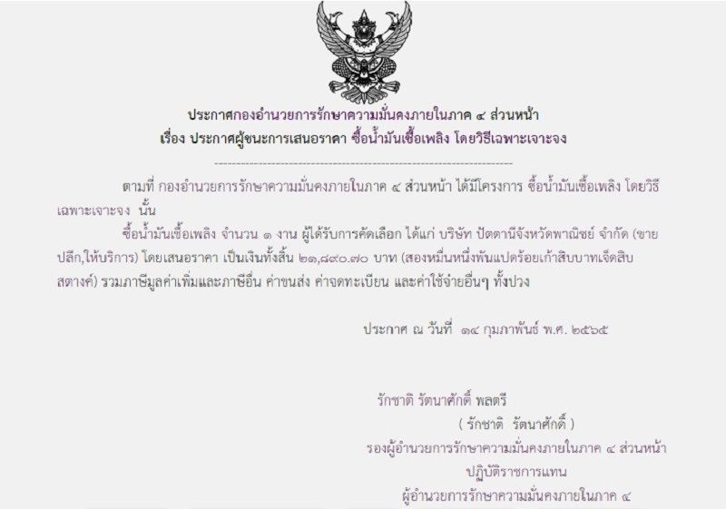 ประกาศผู้ชนะการเสนอราคา ซื้อน้ำมันเชื้อเพลิง โดยวิธีเฉพาะเจาะจง (21,890.70 บาท)