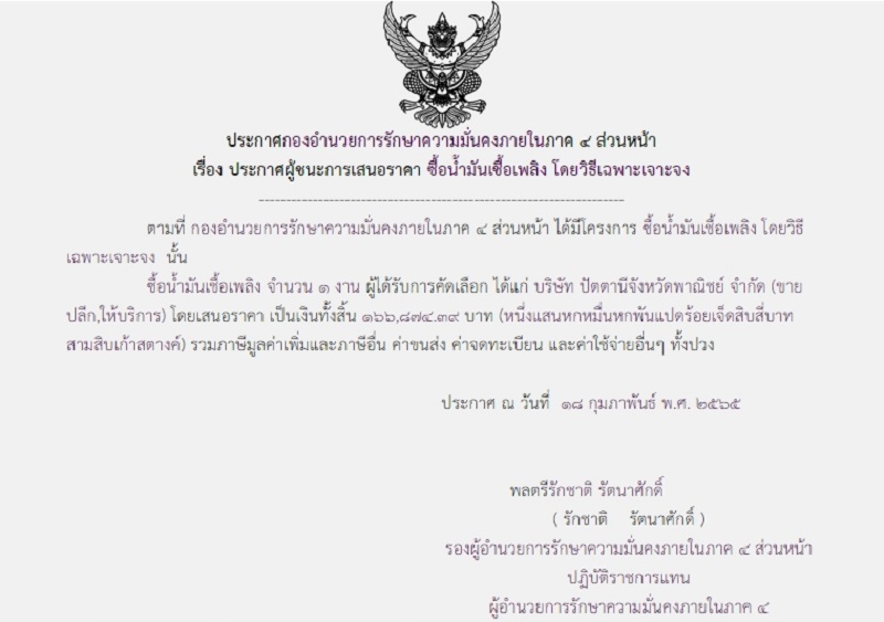 ประกาศผู้ชนะการเสนอราคา ซื้อน้ำมันเชื้อเพลิง โดยวิธีเฉพาะเจาะจง (166,874.39 บาท)