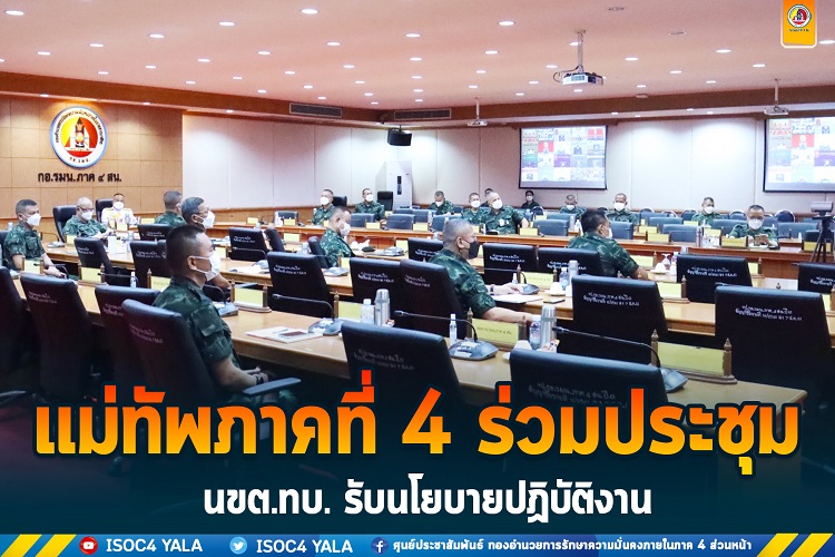 วันนี้ 7 มีนาคม 2565 6 เวลา 10.00 น. ที่ ห้องประชุม (1) กองอำนวยการรักษาความมั่นคงภายในภาค 4 ส่วนหน้า ค่ายสิรินธร ตำบลเขาตูม อำเภอยะรัง จังหวัดปัตตานี พลโท เกรียงไกร ศรีรักษ์ แม่ทัพภาคที่ 4 /ผู้อำนวยการรักษาความมั่นคงภายในภาค 4 ร่วมประชุมชี้แจง และสั่งการของผู้บัญชาการทหารบกต่อผู้บังคับหน่วยขึ้นตรงกองทัพบก ครั้งที่ 3/2565 ผ่านระบบทางไกลผ่านจอภาพ ให้หน่วยรับนโยบายปฏิบัติงานตามพันธกิจ 3 ประการของกองทัพบกให้เกิดประสิทธิภาพ ตลอดจนติดตามผลการปฏิบัติงาน และแนวโน้มสถานการณ์ในพื้นที่ โดยมี พลเอก ณรงค์พันธ์ จิตต์แก้วแท้ ผู้บัญชาการทหารบก เป็นประธานการประชุม