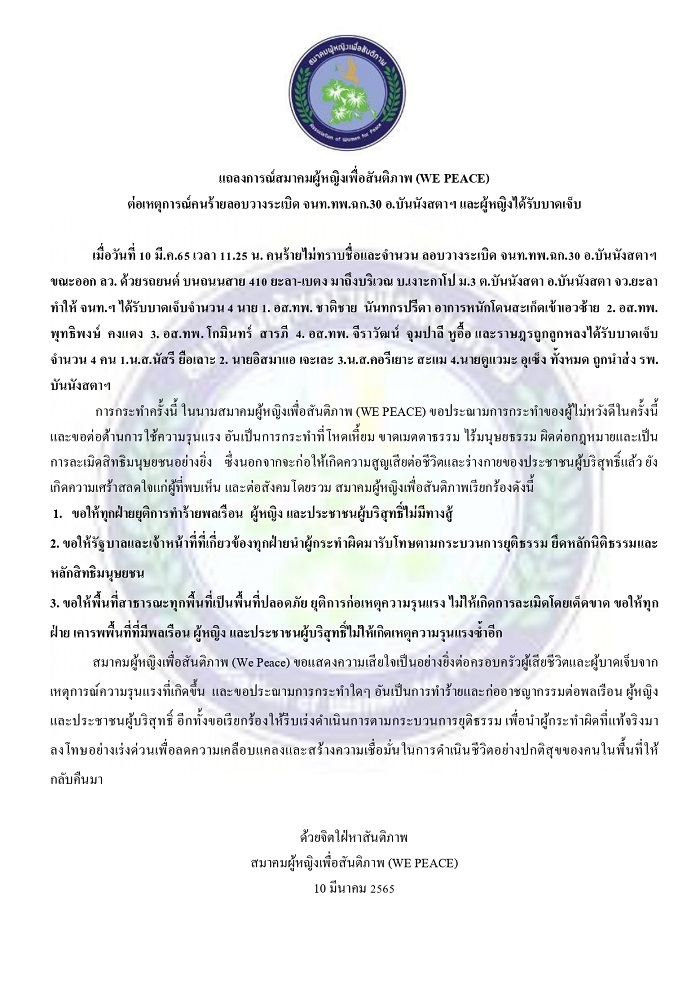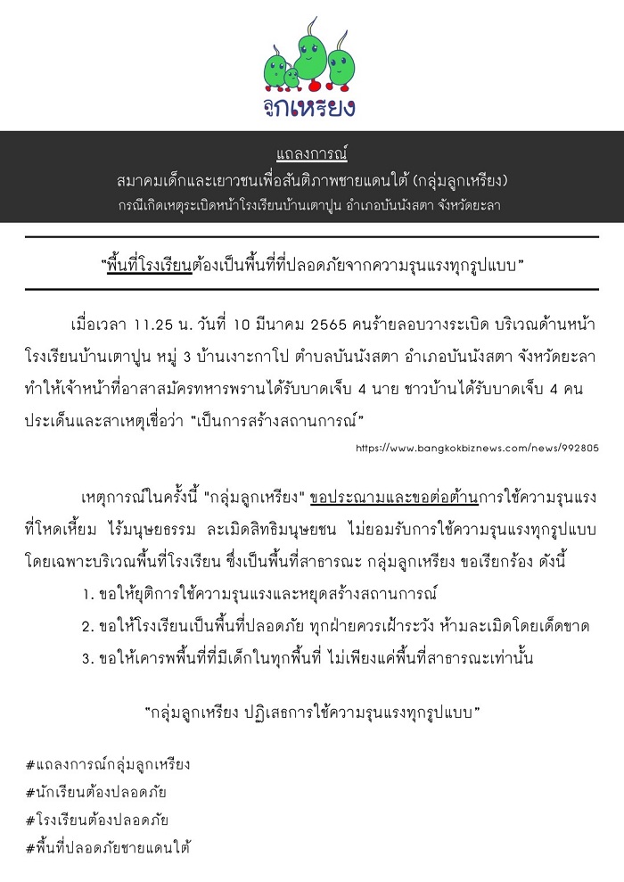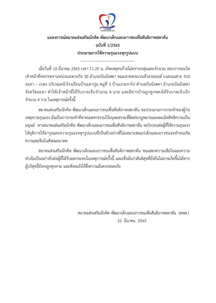 ประชาสัมพันธ์ข่าวประชาสัมพันธ์ แถลงการณ์! ประณามการใช้ความรุนแรงทุกรูปแบบ ต่อเหตุการณ์คนร้ายลอบวางระเบิดเจ้าหน้าที่หน่วยเฉพาะกิจกรมทหารพรานที่ 30 อ.บันนังสตา และทำร้ายประชาชนผู้บริสุทธิ์อย่างไร้มนุษยธรรม March 11, 2022 2232 Share Facebook Twitter Google+ Telegram LINE ศูนย์ประชาสัมพันธ์ กองอำนวยการรักษาความมั่นคงภายในภาค4ส่วนหน้า