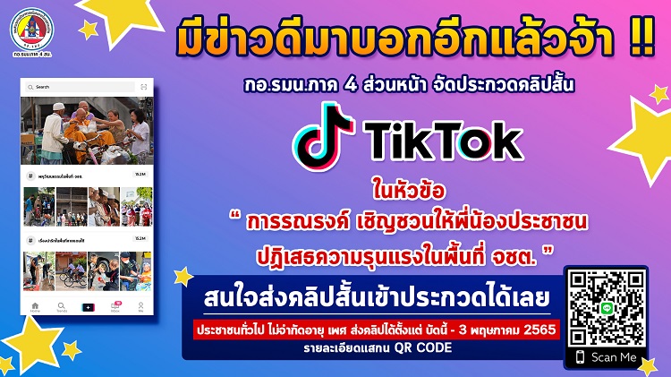 พลโท เกรียงไกร ศรีรักษ์ แม่ทัพภาคที่ 4 จัดการประกวดคลิปสั้น ภายใต้หัวข้อ “การรณรงค์เชิญชวนให้พี่น้องประชาชนปฏิเสธความรุนแรงในพื้นที่ จชต.” ผ่านแพลตฟอร์ม TikTok เพื่อสร้างการรับรู้ และเสริมสร้างความเข้าใจ ให้กับพี่น้องประชาชนทั้งใน และนอกพื้นที่จังหวัดชายแดนภาคใต้