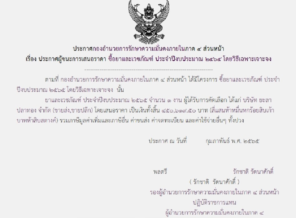 ประกาศผู้ชนะการเสนอราคา ซื้อยาและเวชภัณฑ์ ประจำปีงบประมาณ 2565 โดยวิธีเฉพาะเจาะจง (450,619.50 บาท)