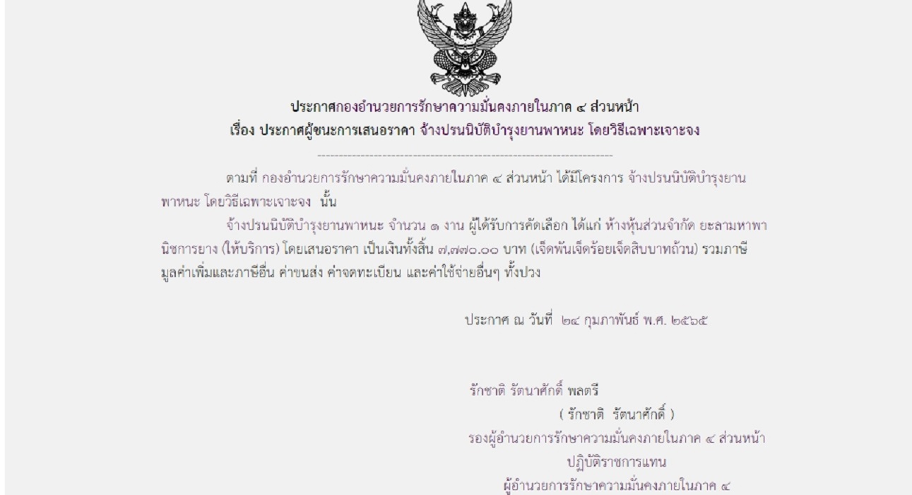 จัดซื้อ จัดจ้างประกาศผู้ชนะการเสนอราคา ประการผู้ชนะการเสนอราคา จ้างปรนนิบัติบำรุงยานพานะ โดยวิธีเฉพาะเจาะจง March 20, 2022 495 Share Facebook Twitter Google+ Telegram LINE