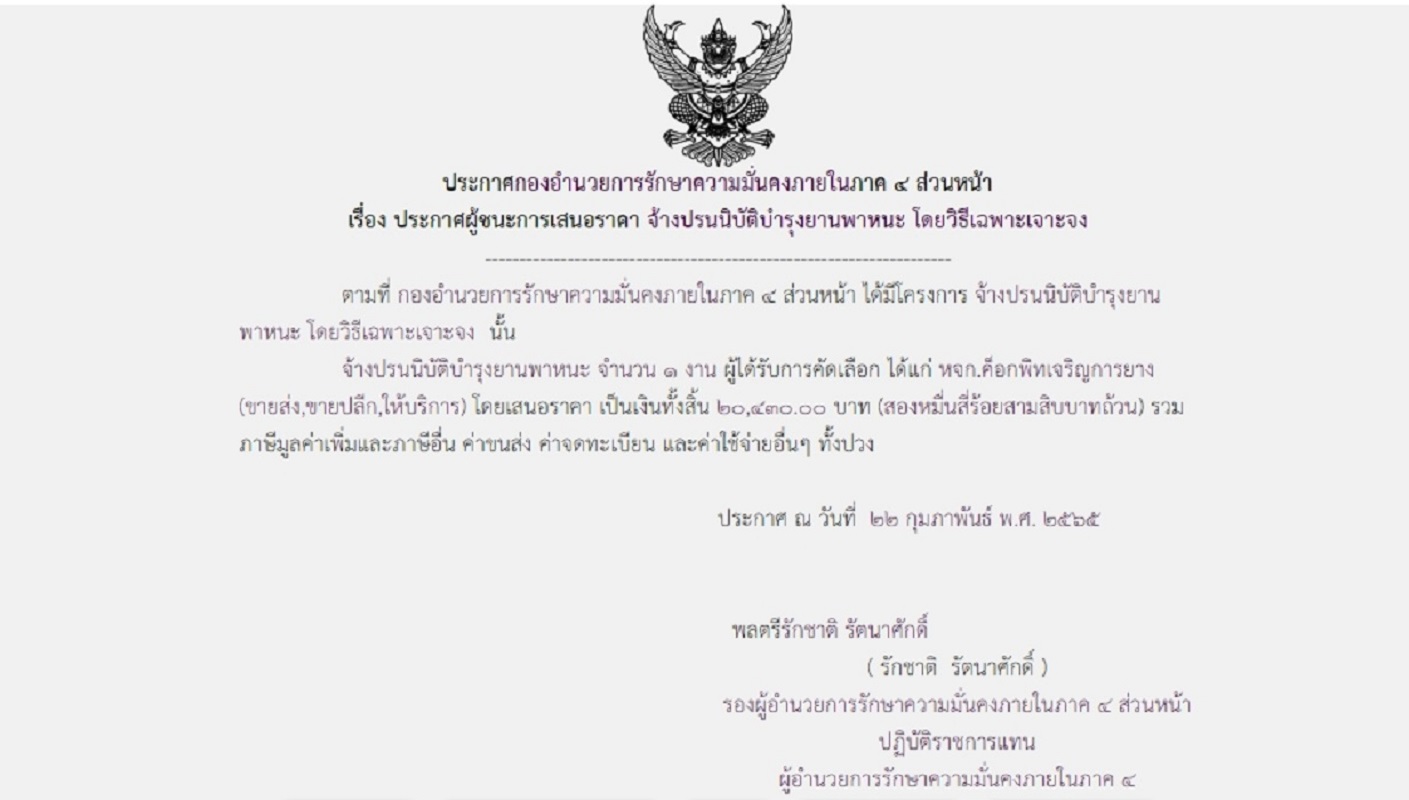 ประการผู้ชนะการเสนอราคา จ้างปรนนิบัติบำรุงยานพานะ โดยวิธีเฉพาะเจาะจง
