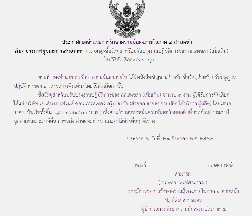 จัดซื้อ จัดจ้างประกาศผู้ชนะการเสนอราคา ประกาศผู้ชนะการเสนอราคา ซื้อวัสดุสำหรับปรับปรุงฐานปฏิบัติการของ ฉก.สงขลา (เพิ่มเติม) โดยวิธีคัดเลือก (1,563,664.00) August 21, 2020 1030 Share Facebook Twitter Google+ Telegram LINE สบป.กอ.รมน.ภาค 4 สน.