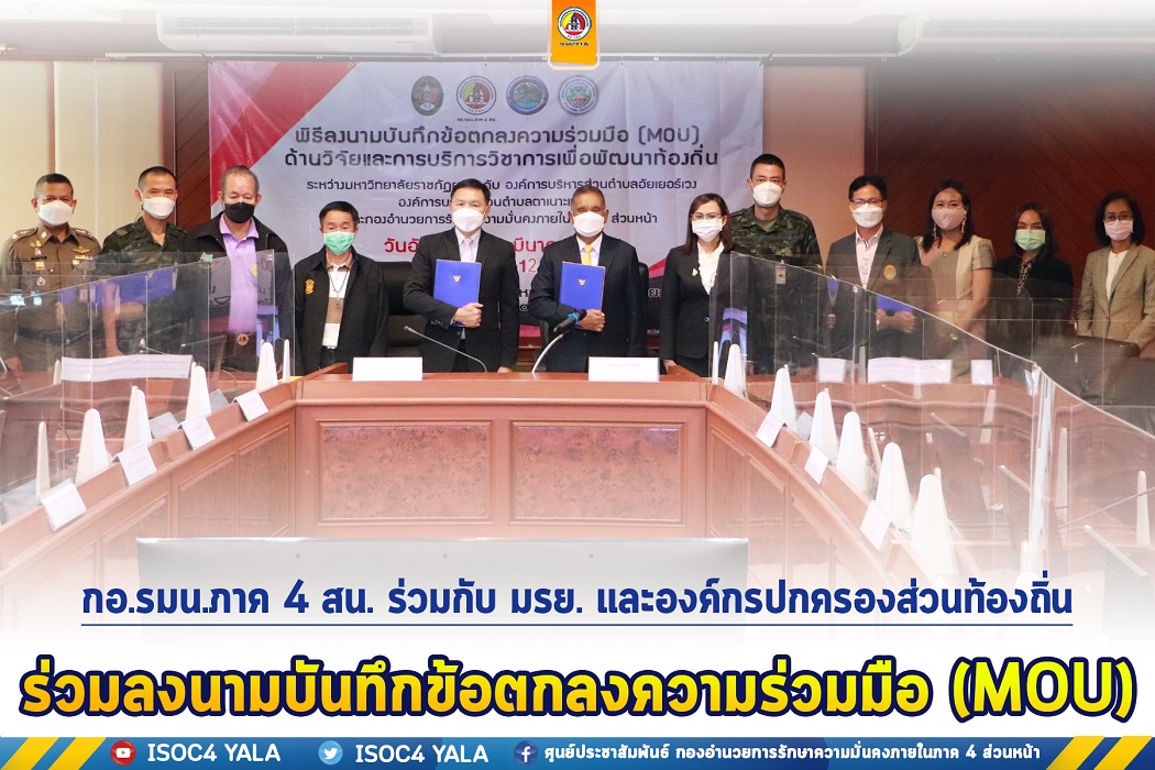 เมื่อวันที่ (22 มีนาคม 2565) ณ ห้องประชุมสภามหาวิทยาลัยราชภัฏยะลา อำเภอเมือง จังหวัดยะลา พลเอก มณี จันทร์ทิพย์ ที่ปรึกษากองอำนวยการรักษาความมั่นคงภายในภาค 4 ส่วนหน้า, ผู้ช่วยศาสตราจารย์ ดร.สมบัติ โยธาทิพย์ อธิการบดีมหาวิทยาลัยราชภัฏยะลา, นาย วีรัต แซ่ตัน นายกองค์การบริหารส่วนตำบลตาเนาะแมเราะ, นาย ณัฐพล พยัฆพันธ์ เลขานายกองค์การบริหารส่วนตำบลอัยเยอร์เวง (ผู้แทน) และส่วนที่เกี่ยวข้อง ร่วมทำบันทึกข้อตกลงความร่วมมือ (MOU) ระหว่างกองอำนวยการรักษาความมั่นคงภายในภาค 4 ส่วนหน้า และส่วนราชการท้องถิ่นในพื้นที่โดยมีวัตถุประสงค์เพื่อบูรณาการความร่วมมือระหว่างมหาวิทยาลัยราชภัฏยะลา กับ กองอำนวยการรักษาความมั่นคงภายในภาค 4 ส่วนหน้าในการเสริมสร้างความมั่นคงในชีวิตความเป็นอยู่ของประชาชนในพื้นที่ตามแนวทางพระราชดำริร่วมสนับสนุนองค์ความรู้ สถานที่ อุปกรณ์ และบุคลากรในการดำเนินงานภายใต้ศูนย์ความเป็นเลิศด้านเศรษฐกิจฐานรากและอุตสาหกรรมบริการ ตลอดจนเพื่อร่วมกันอนุรักษ์วัฒนธรรมที่ดีงามเสริมสร้างสังคมแห่งความสมานฉันท์และการอยู่ร่วมกันอย่างสันติสุขในพื้นที่จังหวัดชายแดนภาคใต้