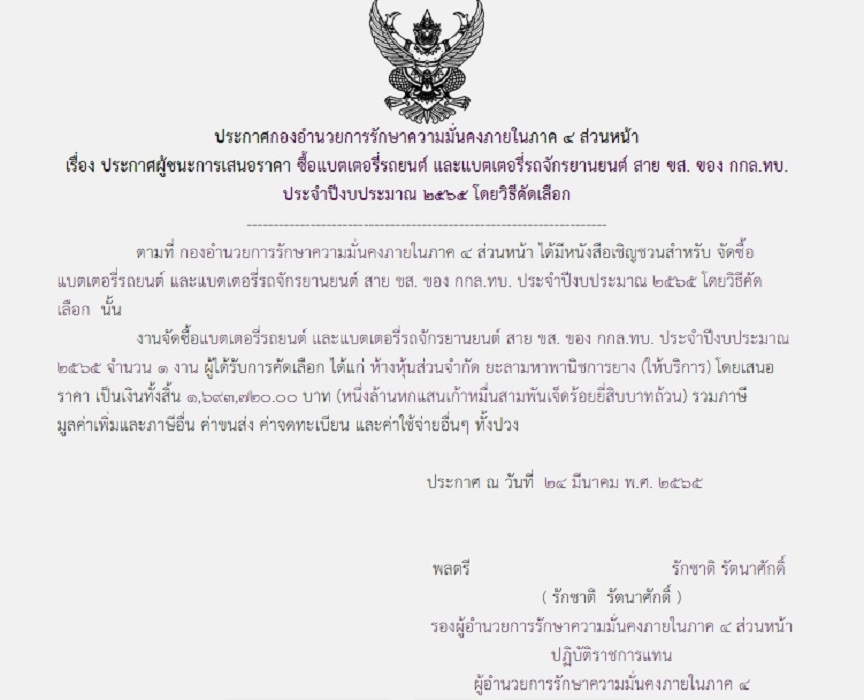 จัดซื้อ จัดจ้างประกาศผู้ชนะการเสนอราคา ประกาศผู้ชนะการเสนอราคา ซื้อแบตเตอรี่รถยนต์ และแบตเตอรี่รถจักรยานยนต์ สาย ขส. ของ กกล.ทบ. ประจำปีงบประมาณ 2565 โดยวิธีคัดเลือก March 24, 2022 507 Share Facebook Twitter Google+ Telegram LINE