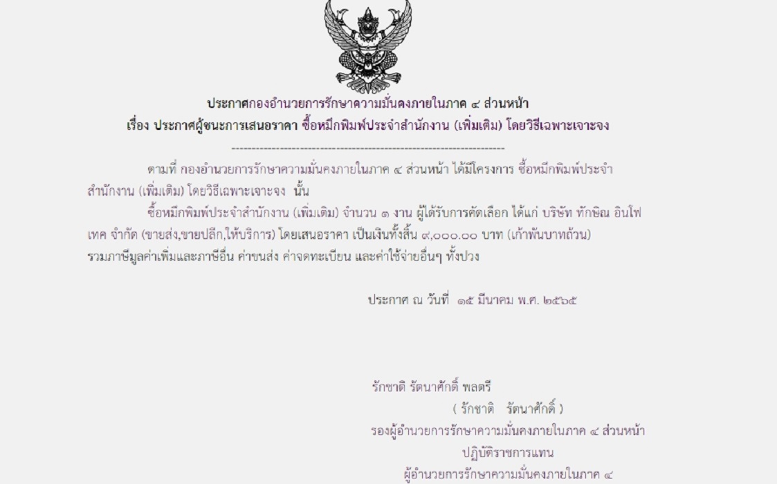 ประกาศผู้ชนะการเสนอราคา ซื้อหมึกพิมพ์ประจำสำนักงาน (เพิ่มเติม) โดยวิธีเฉพาะเจาะจง