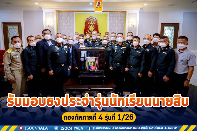 วันนี้ 30 มีนาคม 2565 เวลา 10:00 น. ที่ ห้องพูลสวัสดิ์ กองบัญชาการกองทัพภาคที่ 4 ค่ายวชิราวุธ อำเภอเมือง จังหวัดนครศรีธรรมราช พลโท เกรียงไกร ศรีรักษ์ แม่ทัพภาคที่ 4 รับมอบธงประจำรุ่นจากนักเรียนนายสิบกองทัพภาคที่ 4 รุ่นที่ 1/2526 เก็บไว้ในห้องประวัติศาสตร์และหอเกียรติยศของกองทัพภาคที่ 4 เพื่อเป็นที่ระลึก ตลอดจนเป็นเกียรติประวัติจากรุ่นสู่รุ่น โดยมี ร้อยตรี โยทัย เทพทุ่งหลอง ประธานนักเรียนนายสิบกองทัพภาคที่ 4 รุ่นที่ 1/26 ผู้แทนนักเรียนนายสิบส่งมอบธงประจำรุ่นให้กับแม่ทัพภาคที่ 4 ทั้งนี้ในพิธีดังกล่าวจัดขึ้นภายใต้มาตรการป้องกันการแพร่ระบาดของเชื้อไวรัส covid-19 อย่างเคร่งครัด