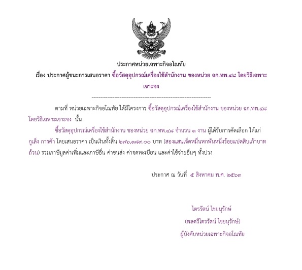 จัดซื้อ จัดจ้างประกาศผู้ชนะการเสนอราคา ประกาศผู้ชนะการเสนอราคา ซื้อวัสดุอุปกรณ์เครื่องใช้สำนักงาน ของหน่วย ฉก.ทพ.48 โดยวิธีเฉพาะเจาะจง (276,189.00) August 22, 2020 964 Share Facebook Twitter Google+ Telegram LINE หน่วยเฉพาะกิจอโณทัย