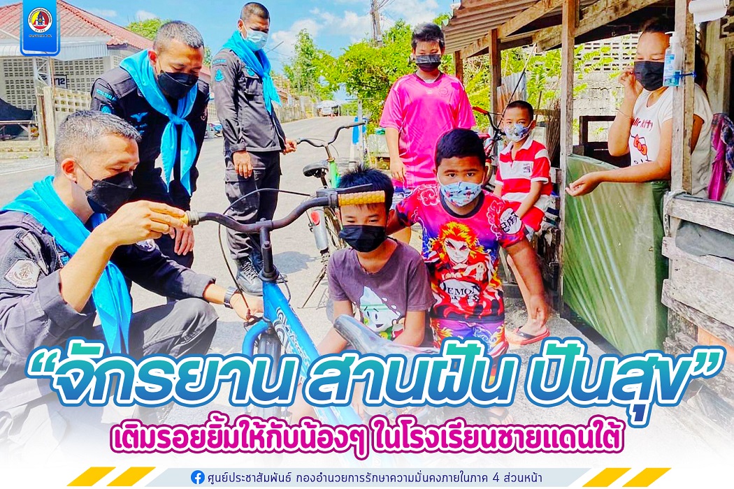 หน่วยเฉพาะกิจกรมทหารพรานที่ 45 โดยชุดปฏิบัตการเสริมสร้างความเข้าใจ ดำเนินการตามนโยบายของผู้บัญชาการทหารบก ในโครงการ “จักรยาน สานฝัน ปันสุข” เพื่อสร้างฝัน เติมรอยยิ้มให้กับน้องๆ ในโรงเรียนในพื้นที่จังหวัดชายแดนภาคใต้ โดยนำจักรยานที่ชำรุด ไม่ใช้แล้ว ซึ่งได้รับการสนับสนุน จากประชาชนในพื้นที่ มาซ่อมแซม/ปรับปรุง ตามมาตรฐานความปลอดภัย ให้พร้อมสำหรับใช้งาน เพื่อมอบให้กับนักเรียนที่มีความจำเป็น สามารถใช้ในการเดินทางไปศึกษาเล่าเรียนในพื้นที่ได้ เพื่อขยายโอกาสร้างแรงบันดาลใจต่อยอดทางการศึกษา นำไปพัฒนาชีวิตความเป็นอยู่สู่ตนเอง ครอบครัว และชุมชนในอนาคต