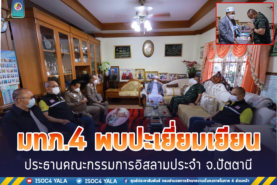 วันนี้ 2 เมษายน 2565 เวลา 09.00 น. ณ บ้านเลขที่ 39 ตำบลรูสะมีแล อำเภอเมือง จังหวัดปัตตานี พลโท เกรียงไกร ศรีรักษ์ แม่ทัพภาคที่ 4/ผู้อำนวยการรักษาความมั่นคงภายในภาค 4 และคณะ เข้าเยี่ยมเยียน นายแวดือราแม มะมิงจิ ประธานคณะกรรมการอิสลามประจำจังหวัดปัตตานี เนื่องในโอกาสเดือนรอมฎอน ประจำปีฮิจเราะห์ศักราช 1443 ซึ่งถือเป็นเดือนอันประเสริฐที่พี่น้องมุสลิมจะได้ปฏิบัติศาสนกิจถือศีลอดเก็บเกี่ยวผลบุญดั่งที่รอคอย ส่งกำลังใจผ่านผู้นำศาสนาไปยังพี่น้องมุสลิมให้ได้ปฏิบัติศาสนกิจอย่างสมบูรณ์ครบถ้วน นอกจากนี้ยังมีความห่วงใยมีความห่วงใยต่อการปฏิบัติศาสนกิจต่างๆ ในสถานการณ์ของการแพร่ระบาดของเชื้อไวรัส covid-19 ขอให้พี่น้องประชาชนได้ปฏิบัติตามประกาศของจุฬาราชมนตรีอย่างเคร่งครัด เพื่อเป็นการควบคุมและลดความเสี่ยงของการแพร่ระบาดอีกด้วย