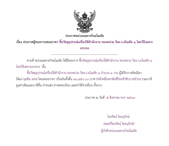 ประกาศผู้ชนะการเสนอราคา ซื้อวัสดุอุปกรณ์เครื่องใช้สำนักงาน ของหน่วย ร้อย.ร.อโณทัย 1 โดยวิธีเฉพาะเจาะจง (16,450.00)