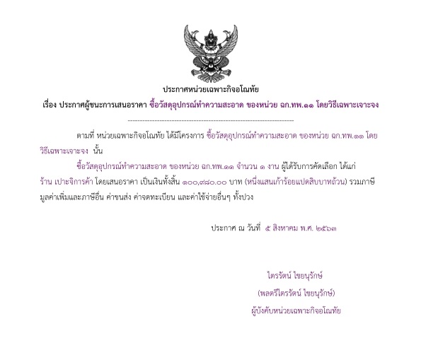ประกาศผู้ชนะการเสนอราคา ซื้อวัสดุอุปกรณ์ทำความสะอาด ของหน่วย ฉก.ทพ.11 โดยวิธีเฉพาะเจาะจง (100,980.00)