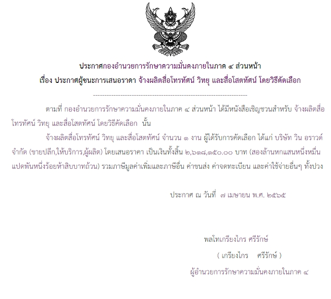 ประกาศผู้ชนะการเสนอราคา จ้างผลิตสื่อโทรทัศน์ วิทยุ และสื่อโสตทัศน์ โดนวิธีคัดเลือก
