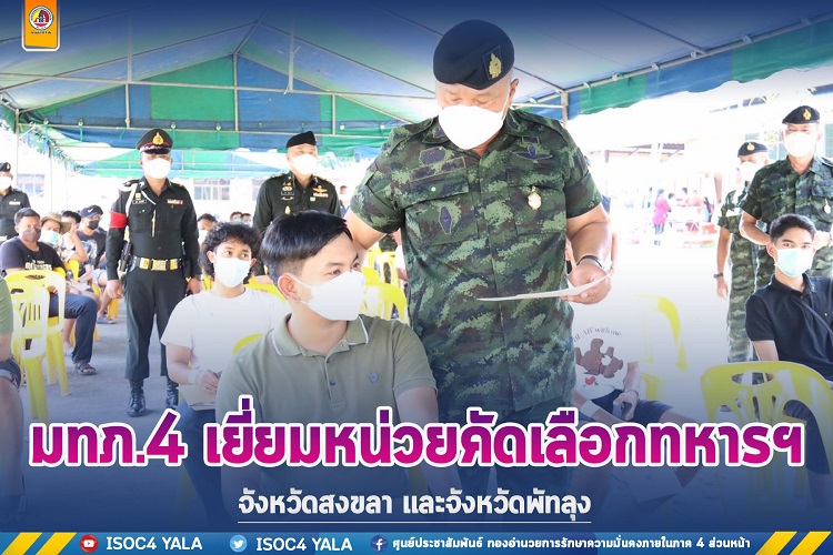 วันนี้ 10 เมษายน 2565 เวลา 09.30 น. พลโท เกรียงไกร ศรีรักษ์ แม่ทัพภาคที่ 4/ผู้อำนวยการรักษาความมั่นคงภายในภาค 4 เดินทางตรวจเยี่ยมหน่วยคัดเลือกทหารกองเกินเข้ากองประจำการ ประจำปี 2565 ได้แก่ หน่วยคัดเลือกทหารฯ พัทลุง คณะที่ 1 ณ ที่ว่าการอำเภอป่าบอน จังหวัดพัทลุง และ หน่วยคัดเลือกทหารฯ สงขลา คณะที่ 2 อำเภอหาดใหญ่ จังหวัดสงขลา ขอบคุณกำนัน ผู้ใหญ่บ้าน ผู้นำท้องที่ ที่คอยสนับสนุน และชักชวนชายไทยออกมาทำหน้าที่ของตนเอง รวมทั้งขอบคุณคณะกรรมการตรวจเลือกทหารฯ เจ้าหน้าที่สาธารณสุข และส่วนที่เกี่ยวข้องที่ทำหน้าที่ได้อย่างสมบูรณ์ ซึ่งจังหวัดพัทลุงจะเสร็จสิ้นการตรวจเลือกทหารฯ วันนี้ สำหรับหน่วยคัดเลือกทหารฯ พัทลุง คณะที่ 1 ในวันนี้มีหมายเรียกตามเกณฑ์เข้ารับการคัดเลือกเป็นทหารกองประจำการ จำนวน 244 ราย มีความต้องการทหารฯ จำนวน 37 ราย แยกเป็นทหารบก 22 ราย และทหารเรือ 15 ราย