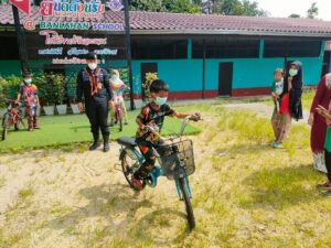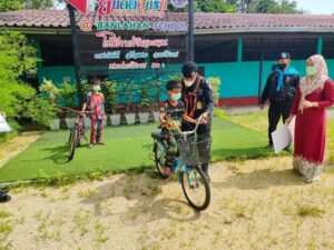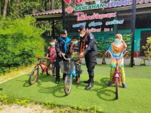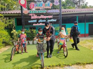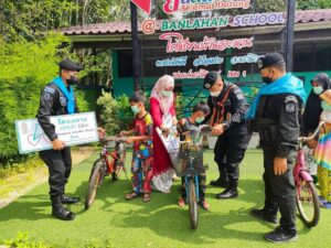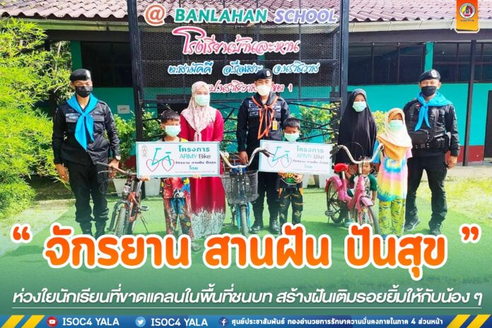 ที่ โรงเรียนบ้านละหาน หมู่ที่ 5 (หมู่บ้านสันติสุข) ตำบลสามัคคี อำเภอรือเสาะ จังหวัดนราธิวาส หน่วยเฉพาะกิจกรมทหารพรานที่ 46 โดยชุดปฏิบัติการเสริมสร้างความเข้าใจ กองร้อยทหารพรานที่ 4601 ร่วมกับ ผู้นำชุมชน และบุคคลากรครู ได้นำรถจักรยานที่ดำเนินการซ่อมเสร็จเรียบร้อยไปมอบให้กับเด็กนักเรียน ตามโครงการ “จักรยาน สานฝัน ปันสุข” ห้วงเดือนรอมฎอนสัมพันธ์สันติสุข โดยการนำรถจักรยานที่ชำรุด ซึ่งได้รับการบริจาคมาซ่อมแซมให้พร้อมสำหรับการใช้งานได้ และมอบให้กับนักเรียนผู้ยากไร้ที่อาศัยอยู่ในถิ่นทุรกันดารสำหรับใช้ไปโรงเรียน จำนวน 3 คัน พร้อมมอบกระเช้าของขวัญให้กับคณะครูบุคคลากรทางการศึกษา เพื่อเป็นการเสริมสร้างความสัมพันธ์อันดีและเสริมสร้างความเข้าใจในการปฏิบัติงานระหว่างเจ้าหน้าที่กับบุคคลากรทางศึกษาในห้วงเดือนรอมฎอนอันประเสริฐ ประจำฮิจเราะห์ ศักราช 1443 สัมพันธ์สันติสุข