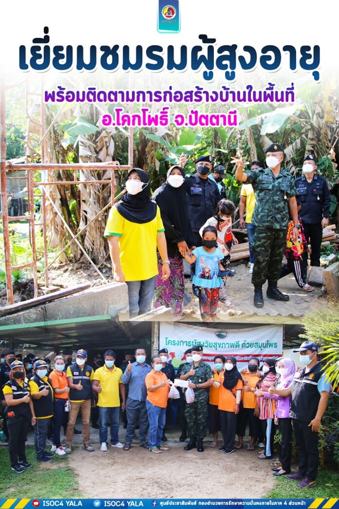 จากนั้น พลตรี อุทิศ อนันตนานนท์ รองผู้อำนวยการรักษาความมั่นคงภายในภาค 4 ส่วนหน้า และคณะ เดินทางต่อเพื่อติดตามการก่อสร้างบ้านและซ่อมแซมบ้าน ตามโครงการ “บ้านปันสุข” ในพื้นที่อำเภอโคกโพธิ์ จังหวัดปัตตานี ซึ่งอยู่ในความรับผิดชอบของหน่วยเฉพาะกิจกรมทหารพรานที่ 43 ได้แก่ น.ส หายาตี สลาเมาะ ณ บ้านเลขที่ 153/3 หมู่ที่ 3 บ้านส้ม ตำบลควนโนรี และบ้านของ นางบิเฮ๊ะ ดือราแม ณ บ้านเลขที่ 11/3 หมู่ที่ 4 บ้านนาค้อใต้ ตำบลมะกรูด อำเภอโคกโพธิ์ จังหวัดปัตตานี พร้อมมอบเครื่องอุปโภค บริโภค ให้แก่ผู้ที่ได้รับมอบบ้านดังกล่าว เพื่อเป็นการบรรเทาความเดือดร้อนในเบื้องต้น พร้อมทั้งได้เน้นย้ำเรื่องการป้องกันการแพร่ระบาดของเชื้อไว้รัสโควิด-19 ตามกระทรวงสาธารณสุขกำหนดอย่างเคร่งครัด