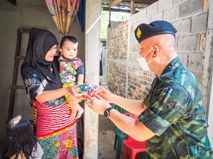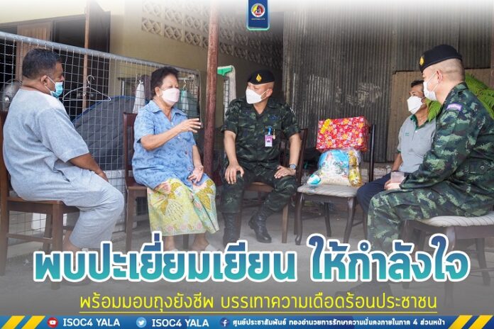 วันที่ (14 เมษายน 2565) เวลา 13.30 น. ที่ ตำบลสะเตง อำเภอเมือง จังหวัดยะลา พลตรี ธนัช ฉิมพาลี ผู้บังคับหน่วยเฉพาะกิจยะลา พร้อมด้วยรองผู้บังคับหน่วยเฉพาะกิจยะลา และคณะ เดินทางไปพบปะเยี่ยมเยียน และให้กำลังใจประชาชน เป็นผู้ป่วยซึ่งได้รับผลกระทบจากสถานการณ์การแพร่ระบาดของเชื้อไวรัสโควิด-19 รวมทั้งได้สอบถามปัญหาต่างๆ ในการดำเนินชีวิตประจำวัน เพื่อหาแนวทางในการช่วยเหลือในโอกาสต่อไป