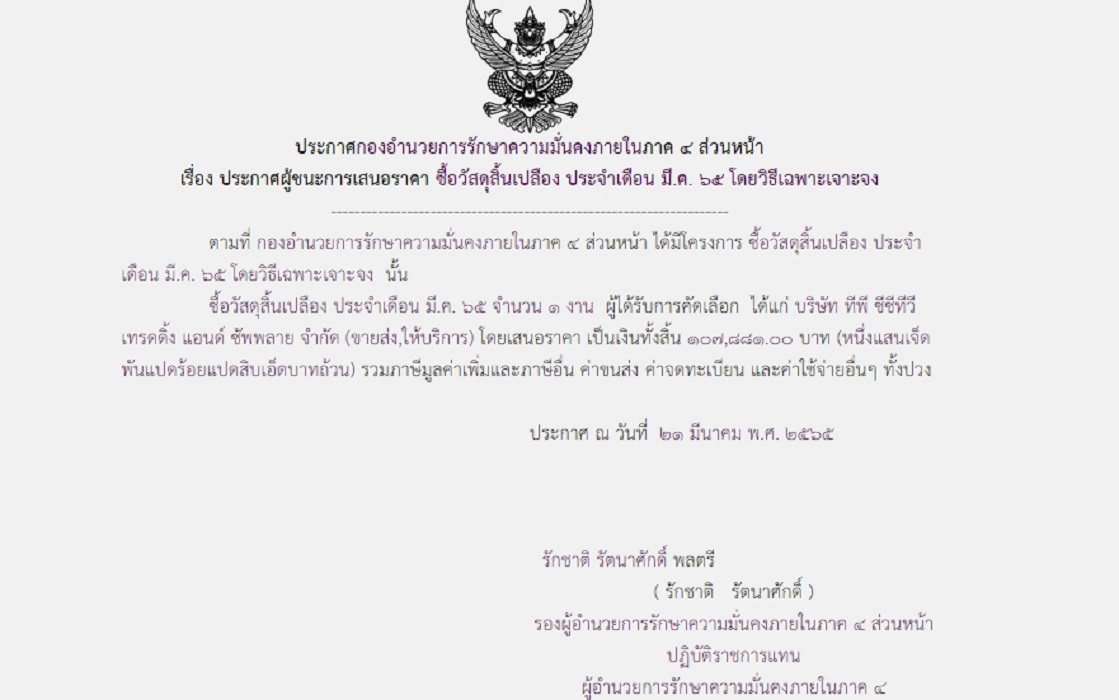 ประกาศผู้ชนะการเสนอราคา ซื้อวัสดุสิ้นเปลือง ประจำเดือน มี.ค.65 โดยวิธีเฉพาะเจาะจง