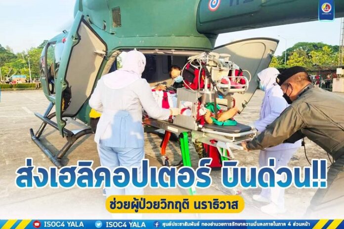 เมื่อวันที่ 18 เมษายน 2565 เวลา 16.45 น. กองอำนวยการรักษาความมั่นคงภายในภาค 4 ส่วนหน้า ได้รับการประสานจากโรงพยาบาลสุไหงโก-ลก และสถาบันการแพทย์ฉุกเฉินแห่งชาติ ผ่านแพทย์ใหญ่กองทัพภาคที่ 4/ผู้อำนวยการศูนย์ประสานการแพทย์จังหวัดชายแดนภาคใต้ ขอรับการสนับสนุนการลำเลียงผู้ป่วยด้วยเฮลิคอปเตอร์ เพื่อช่วยเหลือผู้ป่วยเข้ารับการผ่าตัดโรคหลอดเลือดสมองตีบ จากจังหวัดนราธิวาส ไปยัง อำเภอหาดใหญ่ จังหวัดสงขลา ทราบชื่อ นายนพดล อีหวั่น อายุ 68 ปี ภูมิลำเนา ตำบลสุไหงโก-ลก อำเภอสุไหงโก-ลก จังหวัดนราธิวาส ซึ่งต้องได้รับรักษา ณ โรงพยาบาลหาดใหญ่ อำเภอหาดใหญ่ จังหวัดสงขลา