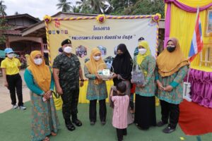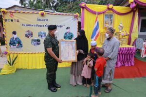 พร้อมกันนี้แม่ทัพภาคที่ 4 ได้มอบพระบรมฉายาลักษณ์ พระบาทสมเด็จพระเจ้าอยู่หัวฯ และสมเด็จพระนางเจ้าพระบรมราชินี ก่อนมอบป้ายชื่อบ้าน ถุงยังชีพ ชุดเครื่องนอน ชุดเครื่องครัว จักรยาน อุปกรณ์กีฬา เครื่องอุปโภค บริโภค แก่ครอบครัว ที่ได้รับการสนับสนุนจากหน่วยต่าง ๆ ในพื้นที่ รวมถึงองค์กรภาครัฐและเอกชน และได้มอบเงินช่วยเหลือเพิ่มเติม ให้แก่ครอบครัวเจ้าของบ้าน เพื่อเป็นการต่อยอดการดำเนินชีวิตพัฒนาคุณภาพชีวิตข้างหน้า และได้เฉลิมฉลองวันฮารีรายอที่กำลังจะถึงในเร็วๆนี้ต่อไป
