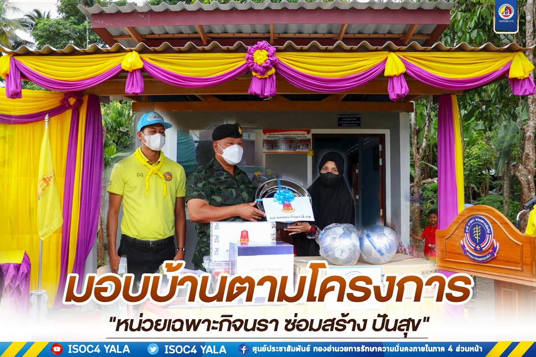 วันนี้ 20 เมษายน 2565 เวลา 08.30 น. ณ บ้านเลขที่ 5/1 หมู่ 6 บ้านบลูกาฮีเล ตำบลบาตง อำเภอรือเสาะ จังหวัดนราธิวาส พลโท เกรียงไกร ศรีรักษ์ แม่ทัพภาคที่ 4/ผู้อำนวยการรักษาความมั่นคงภายในภาค 4 เป็นประธานมอบบ้านตามโครงการ “หน่วยเฉพาะกิจนรา ซ่อมสร้าง ปันสุข” ให้แก่นางสาว ซูไวบ๊ะ กรือสะ เพื่อเป็นการบรรเทาความเดือดร้อน ยกระดับพัฒนาคุณภาพชีวิตของประชาชนในพื้นที่ ตลอดจนเพื่อเป็นของขวัญในเดือนรอมฎอนอันประเสริฐ ตอบแทนความเสียสละ และจิตสาธารณะให้ความร่วมมือกับหน่วยงานของรัฐเสมอมา โดยมีพันเอก ก่อเกียรติ เข็มแดง รองผู้บังคับหน่วยเฉพาะกิจนราธิวาส, พันเอก ทรงเดช สุกนุ้ย ผู้บังคับหน่วยเฉพาะกิจกรมทหารพรานที่ 46 ส่วนราชการ ผู้นำท้องที่ ท้องถิ่น และพี่น้องประชาชนในพื้นที่ร่วมในพิธี ภายใต้มาตราการป้องกันการแพร่ระบาดของเชื้อไวรัส covid-19 อย่างเคร่งครัด