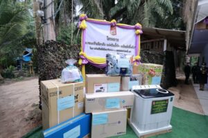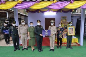 พร้อมกันนี้ แม่ทัพภาคที่ 4 ได้มอบพระบรมฉายาลักษณ์ พระบาทสมเด็จพระเจ้าอยู่หัวฯ และสมเด็จพระนางเจ้าพระบรมราชินี มอบป้ายชื่อบ้าน มอบทะเบียนบ้าน ก่อนมอบชุดเครื่องนอน ชุดเครื่องครัว เครื่องใช้ไฟฟ้า และอุปกรณ์จำเป็นอื่น ๆ แก่ครอบครัว ซึ่งได้รับการสนับสนุนจากหน่วยต่าง ๆ ในพื้นที่ นอกจากนี้ยังได้มอบอุปกรณ์กีฬาให้กับโรงเรียน และมอบถุงยังชีพให้กับผู้เข้าร่วมพิธี และครัวเรือนข้างเคียงอีกด้วย