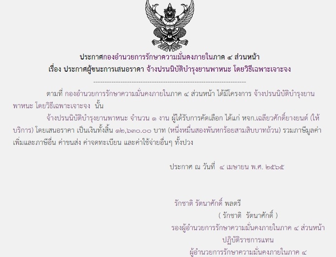 จัดซื้อ จัดจ้างประกาศผู้ชนะการเสนอราคา ประกาศผู้ชนะการเสนอราคา จ้างปรนนิบัติบำรุงยานพาหนะ โดยวิธีเฉพาะเจาะจง (12,630.00 บาท) April 22, 2022 439 Share Facebook Twitter Google+ Telegram LINE สกบ.กอ.รมน.ภาค 4 สน.