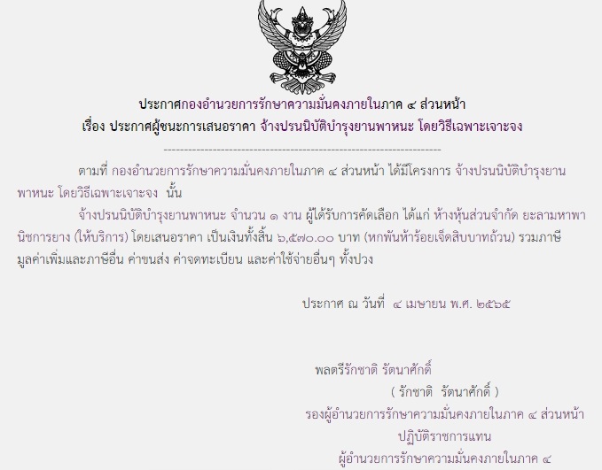 จัดซื้อ จัดจ้างประกาศผู้ชนะการเสนอราคา ประกาศผู้ชนะการเสนอราคา จ้างปรนนิบัติบำรุงยานพาหนะ โดยวิธีเฉพาะเจาะจง (6,570.00 บาท) April 22, 2022 508 Share Facebook Twitter Google+ Telegram LINE สกบ.กอ.รมน.ภาค 4 สน.