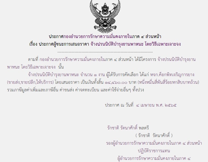 จัดซื้อ จัดจ้างประกาศผู้ชนะการเสนอราคา ประกาศผู้ชนะการเสนอราคา จ้างปรนนิบัติบำรุงยานพาหนะ โดยวิธีเฉพาะเจาะจง (14,460.00 บาท) April 22, 2022 435 Share Facebook Twitter Google+ Telegram LINE สกบ.กอ.รมน.ภาค 4 สน.