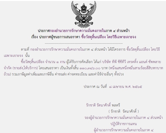 จัดซื้อ จัดจ้างประกาศผู้ชนะการเสนอราคา ประกาศผู้ชนะการเสนอราคา ซื้อวัสดุสิ้นเปลือง โดยวิธีเฉพาะเจาะจง (110,346.00 บาท) April 23, 2022 519 Share Facebook Twitter Google+ Telegram LINE สกบ.กอ.รมน.ภาค 4สน.