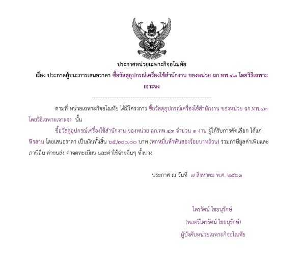 ประกาศผู้ชนะการเสนอราคา ซื้อวัสดุอุปกรณ์เครื่องใช้สำนักงาน ของหน่วย ฉก.ทพ.43 โดยวิธีเฉพาะเจาะจง (65,200.00)
