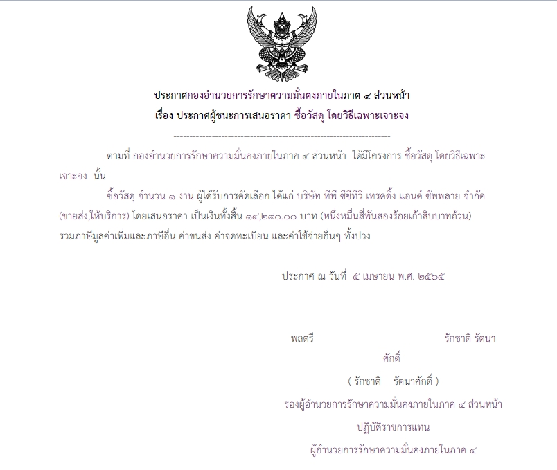 ประกาศผู้ชนะการเสนอราคา ซื้อวัสดุ โดยวิธีเฉพาะเจาะจง (14,290.00 บาท)