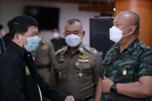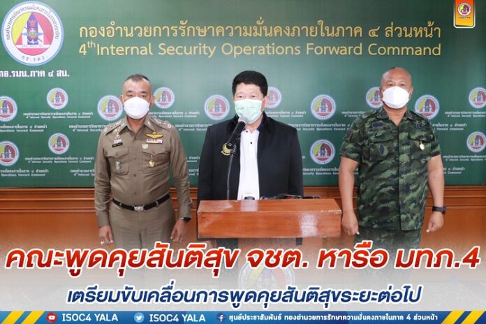 วันนี้ (3 พฤษภาคม 2565) เวลา 10.00 น. ที่กองอำนวยการรักษาความมั่นคงภายในภาค 4 ส่วนหน้า ค่ายสิรินธร ตำบลเขาตูม อำเภอยะรัง จังหวัดปัตตานี พลเอก วัลลภ รักเสนาะ หัวหน้าคณะพูดคุยเพื่อสันติสุขจังหวัดชายแดนภาคใต้ พร้อมคณะฯ ประชุมหารือร่วมกับ พลโท เกรียงไกร ศรีรักษ์ แม่ทัพภาคที่ 4/ผู้อำนวยการรักษาความมั่นคงภายในภาค 4 เกี่ยวกับแนวทางการขับเคลื่อนกระบวนการการพูดคุยเพื่อสันติสุขจังหวัดชายแดนภาคใต้ในระยะต่อไป เพื่อนำสันติสุขอย่างยั่งยืน หลังรอมฎอนสันติสุข เห็นผล เหตุลดลงอย่างมีนัยสำคัญ
